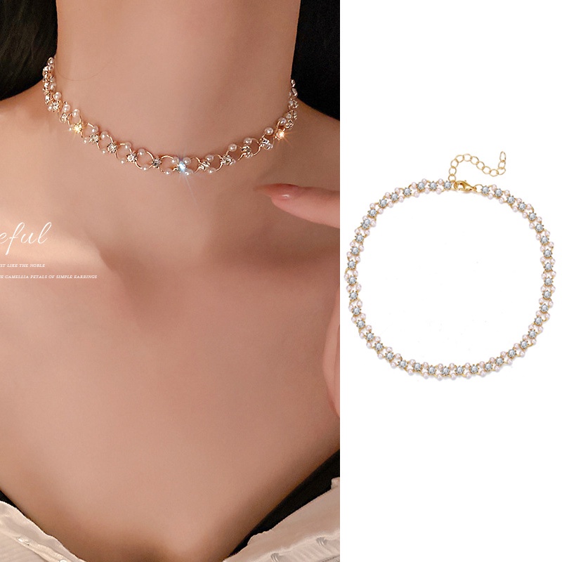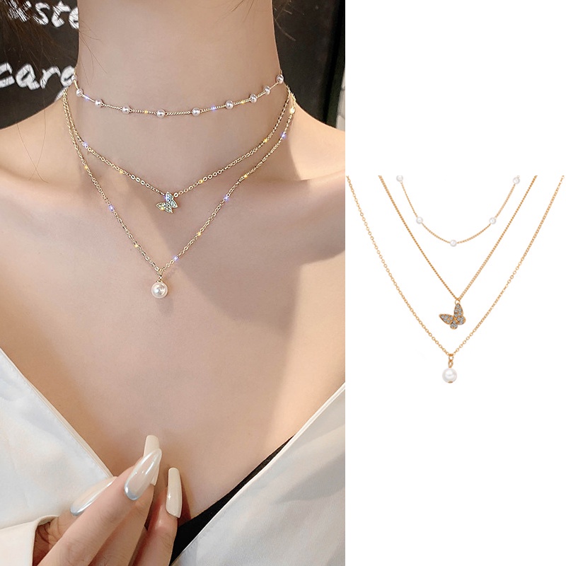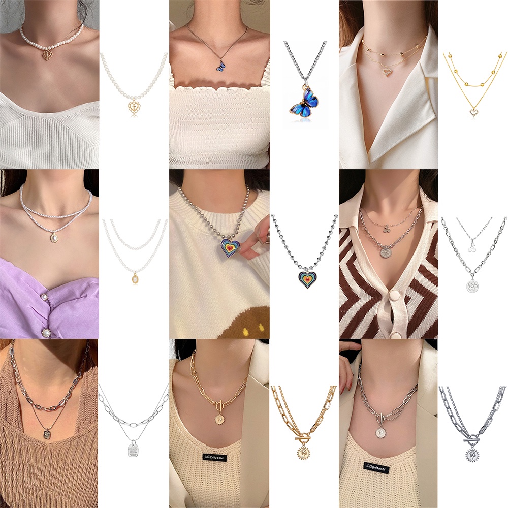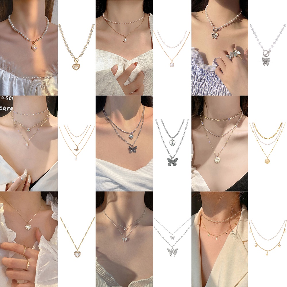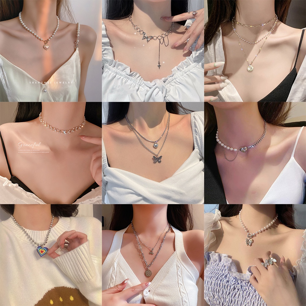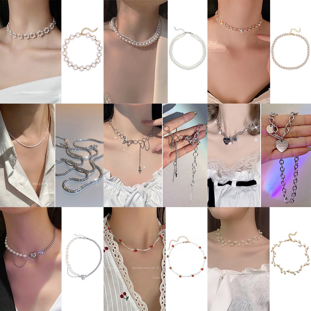 Harga 17KM Korean Fashion Pearl Rhinestone Beads Necklace Heart Shape Butterfly Portrait Pendant Chain Choker Women Accessories