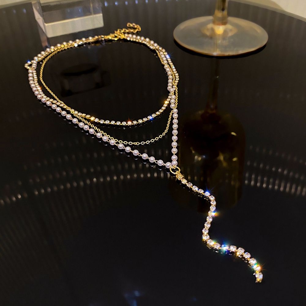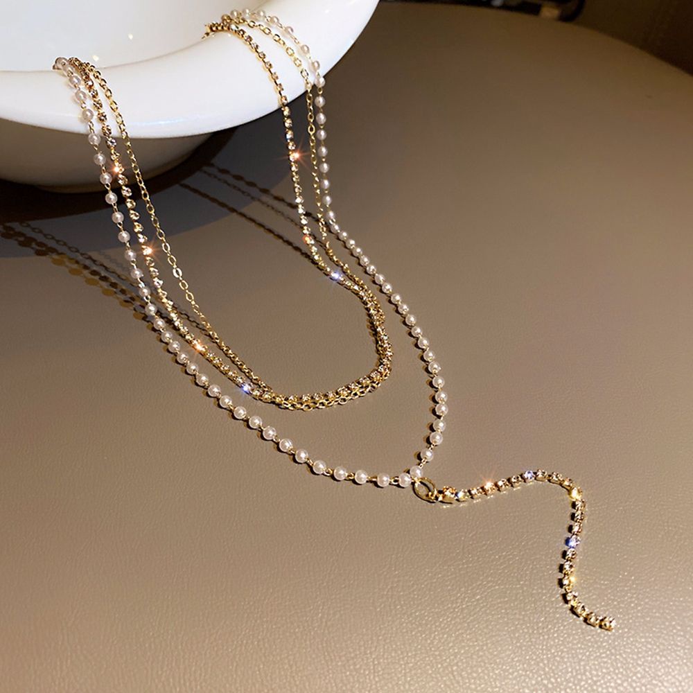 AHOUR Retro Diamond Necklace Exquisite Multi-layered Pearl Necklace Luxury Elegant Korean Jewelry Gift Alloy Simple Female Clavicle Chain/Multicolor