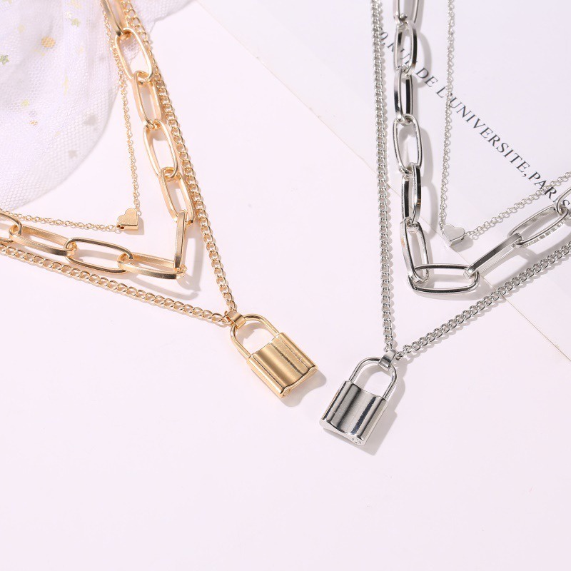 Harga Gembok 3 layer Necklace Kalung Wanita Logam Metal Gold Silver Multilayer Retro Heart Lock Liontin Emas Aksesoris Wanita [A1-2]
