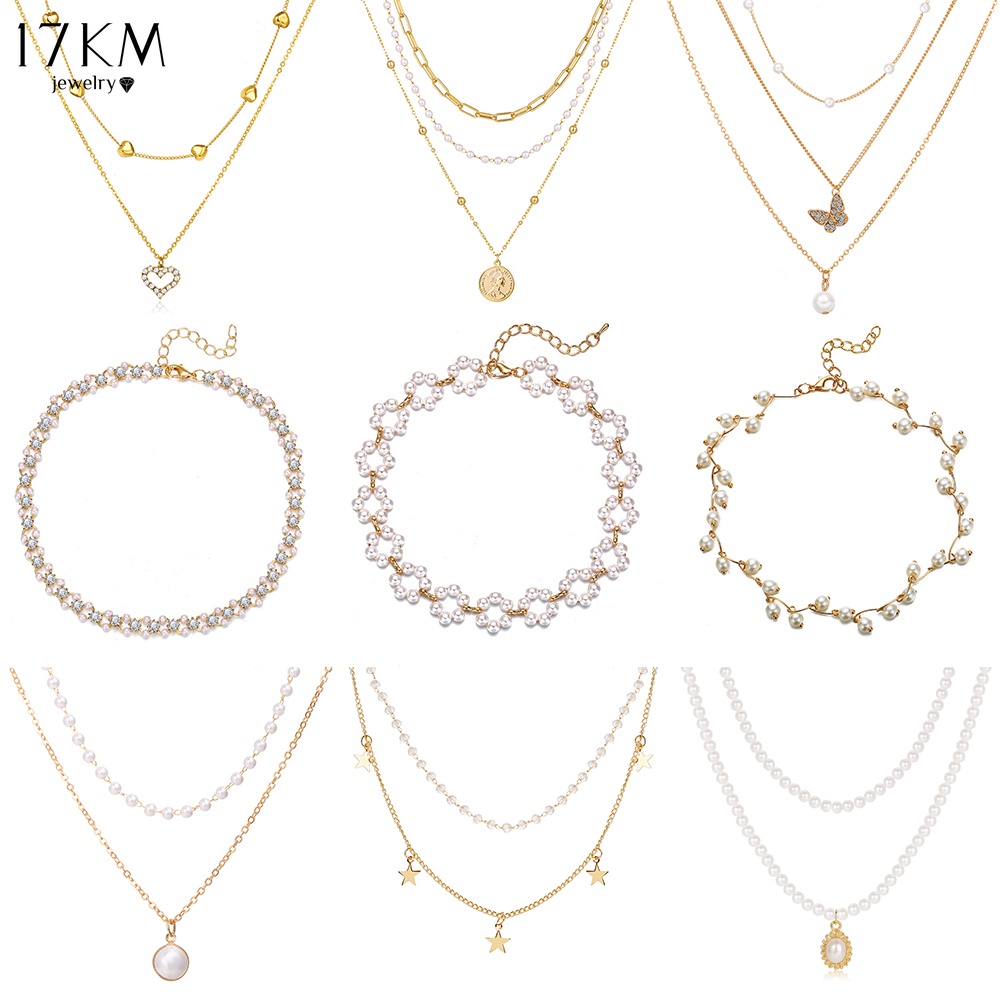 17KM Korean Fashion Pearl Rhinestone Beads Necklace Heart Shape Butterfly Portrait Pendant Chain Choker Women Accessories