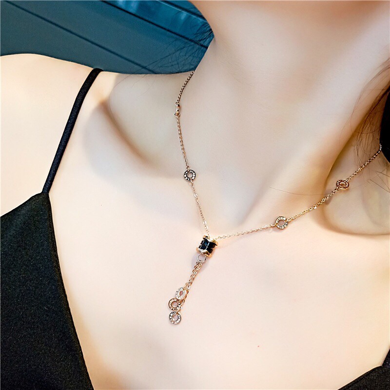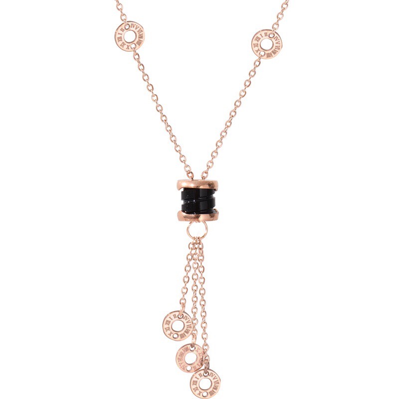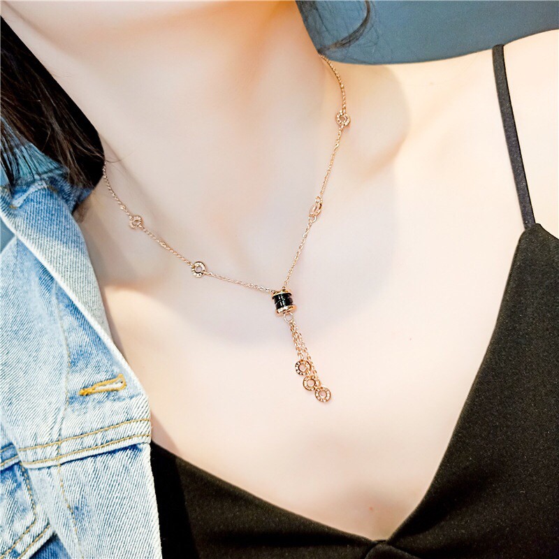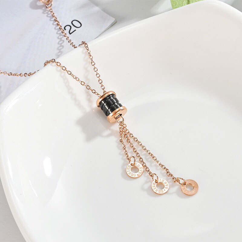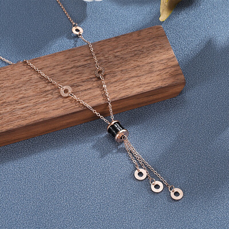 Harga 257# Kalung Wanita titanium lapis emas 18k model Liontin Bulat Hitam Rumbai rosegold
