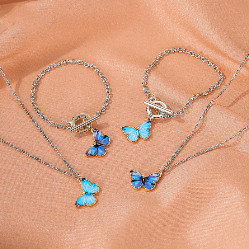 (JIUERBA)COD Korean Fashion Kalung Kupu-kupu Gradien Biru Gelang In Rantai Butterfly Necklace Bracelet Klavikula Wanita Gaya Aksesori Busana Couple