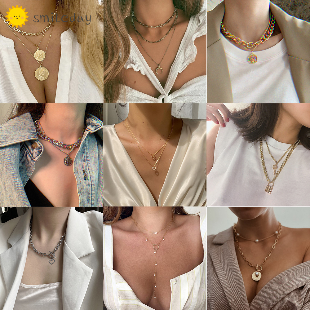 Korea Multilayer Liontin Kalung Emas Jantung Fashion Rantai Kalung Wanita Aksesoris Perhiasan Hadiah