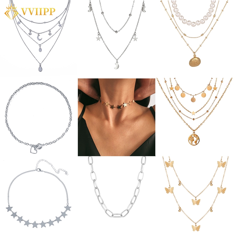Korean Perak Kalung Rantai Choker Multilayer Warna Emas Aksen Mutiara Gaya Vintage Untuk Wanita Aksesoris